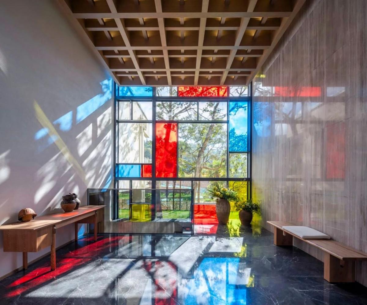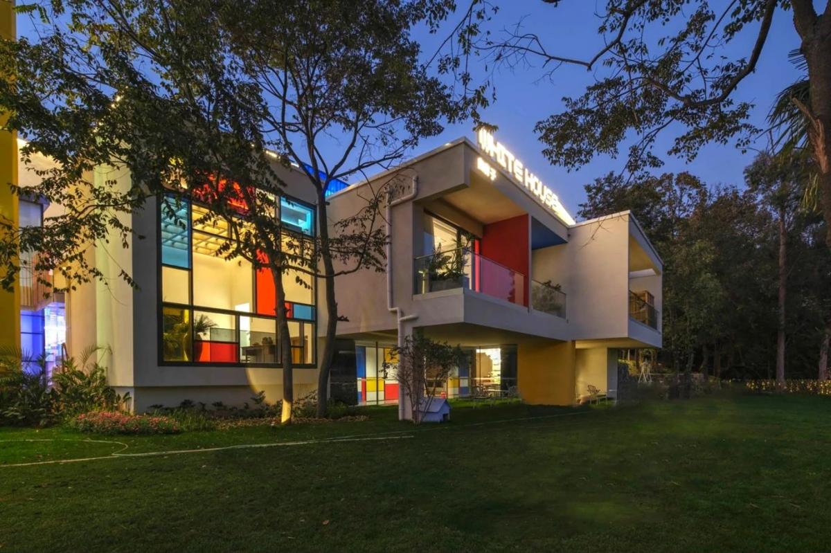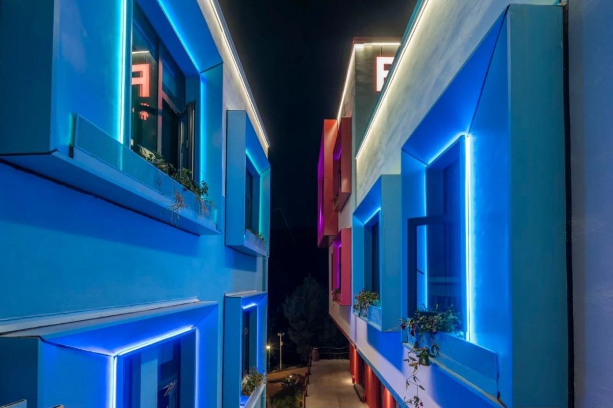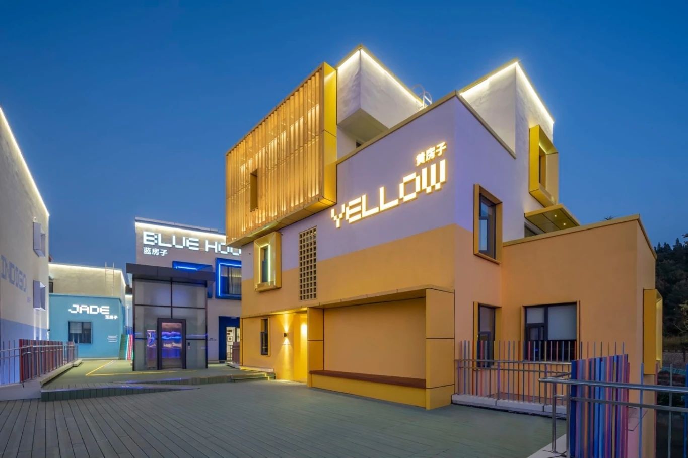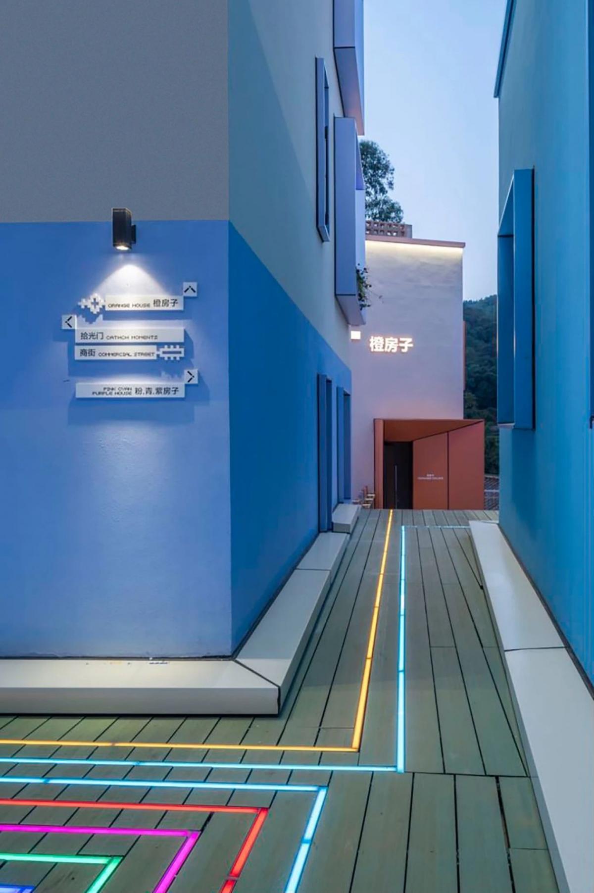 項目位于云南省玉溪市澄江飛大田,建筑師是以七彩的顏色來表現,每棟建筑一種顏色,所以他每棟的名字叫做橙房子、藍房子、青房子等。