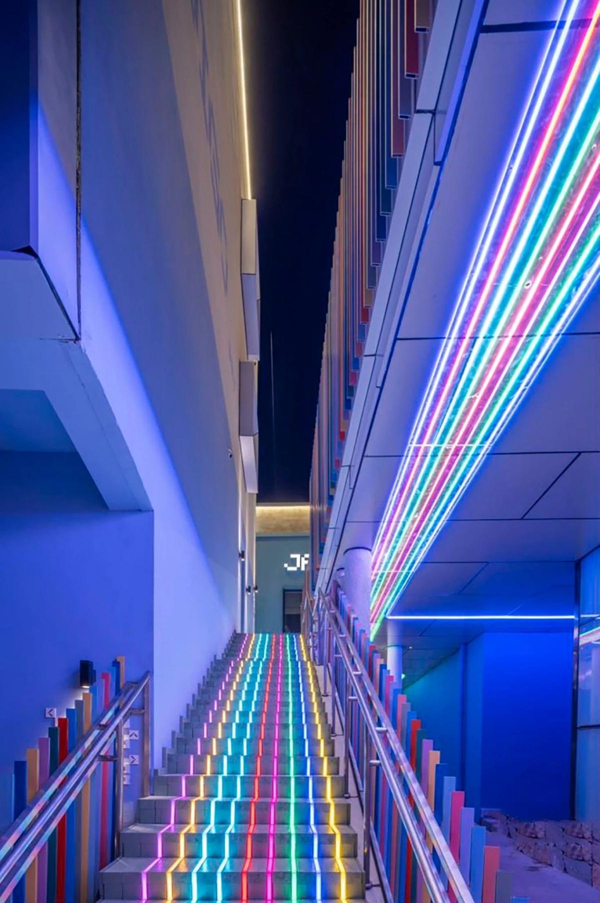 在空中連廊的上層吊頂和地面平臺采用內嵌彩色燈帶作為指示系統,每一條燈帶的顏色對應相同顏色的建筑,每一種顏色的燈帶都指向由同樣顏色命名的酒店入口,通過這種簡潔有趣的引導方式既起到導向標識作用同時又可作為功能照明點亮連廊空間。